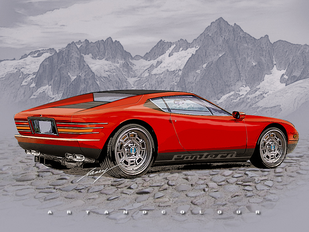 My de Tomaso Pantera for 2012—Autoblog.com published a short post this morning saying the De Tomaso may introduce a new Pantera next year. They showed a new crossover, the Deauville, based heavily on the Cadillac SRX in Geneva last week. It wasnt' pretty, in fact it was downright dowdy. When I read they were going to take a stab at the Pantera, I immediately thought of the Mercury Cyclone I chopped in 2007, and decided to "rechop" it into a Pantera. The filtered look I chose back in 2007 made the recycled chop faster and easier to do. Click image to enlarge.